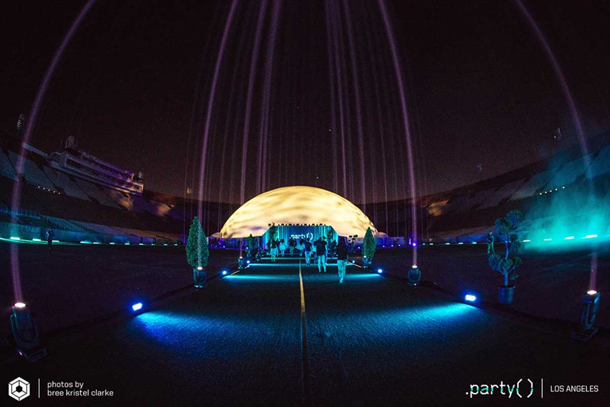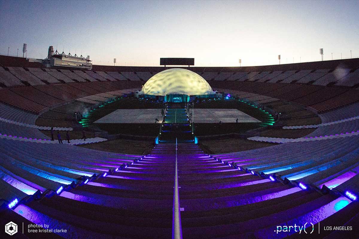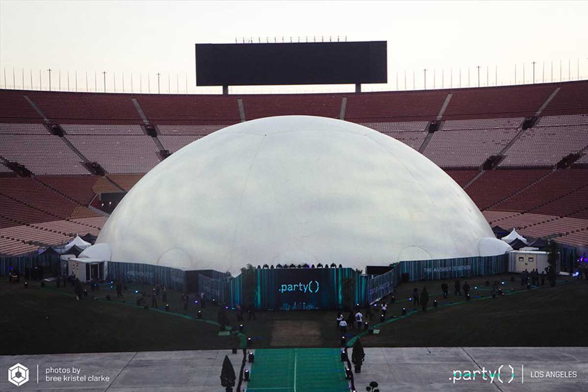 Celestial Dome rental from Absolute Hollywood — the world’s largest portable projection dome at 235 feet (71.6 meters) in diameter, with 43,373 square feet of clear-span floor space and full hemispherical projection covering every inch of the interior surface. Capable of hosting 8,000+ guests in a complete fulldome projection environment, the Celestial Dome has been deployed for Fortune 500 product launches, major music festivals, and world-class events across 33+ countries since 1999 — available worldwide. With a combined interior and exterior projection surface 120 times larger than IMAX, nothing else delivers this level of immersive dome impact. Large-format custom configurations are also available exceeding 100,000 square feet — accommodating audiences of 20,000 and greater.